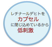 ビタミンA群の安定したレチノイン酸です。カプセルに閉じ込められているため、肌に刺激を与えることなく、肌内部に浸透します。肌の角質落としと同時に、肌内部の基底層から新しい肌細胞を作り押し上げる力があります。ビタミンA が角質落としをするフルーツ酸に比べ、アンチエイジング用として使われるのは衰えた肌の細胞分裂をまた元気にさせる働きがあるからです。